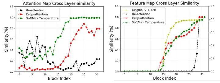 如图5所示的黑色线代表最后一个特征图与前面每个特征图的相似度;红色线代表相邻的层中具有相似的attention map的比例。从大概20层之后,这个相似度变得非常高,使得学习到的特征图和attention map都差不多了。这一观察表明,attention collapse这个问题是ViT不可扩展问题的原因。