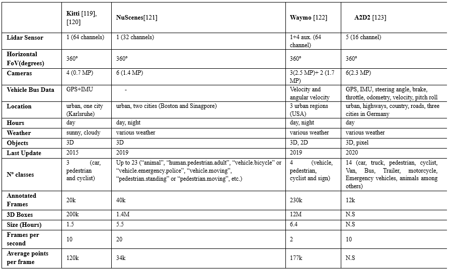 下面,我们将在多种设置的环境下收集的数据进行比较,并分析了它们构成.例如,在 Waymo数据集上,大约有6.1M标记的车辆,只有2.98M标记的行人和骑自行车的人.KITTI基准由7.481k训练图像和7.518k测试图像以及相应的点云组成,这些点云总共包括80.256k标记对象.这些基准还包括不同的类别,例如,KITTI包括3个类别:汽车、行人和自行车,而nuScenes包括23个类别的对象.