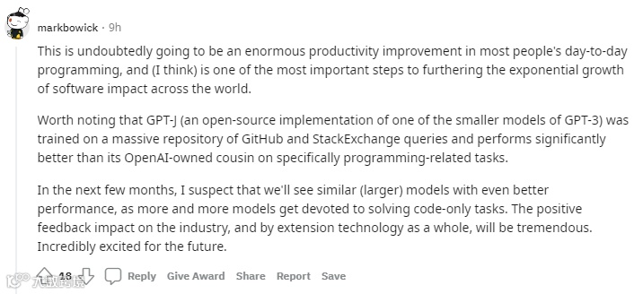 GitHub Copilot的发布在Reddit上引发了热烈的讨论,不少网友看好编码自动化的产业趋势,网友@markbowick说道: