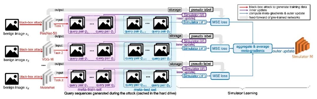模拟器的训练流程开始之前,为了达到模拟任意黑盒模型的泛化能力,我们收集了大量不同的分类网络,如VGG-19、ResNet-50、MobileNet等来构建task,如此便建造了一个巨大的模拟环境。每个task中包含的数据是如下步骤生成得到:1.随机选择一个已训网络;2.施加Bandits攻击来攻击该网络产生的中间数据,数据包括攻击中产生的query sequence和与之对应的该网络的输出logits两种;3.query sequence按照query pair生成对应的迭代编号被切分成两部分:meta-train set和meta-test set。