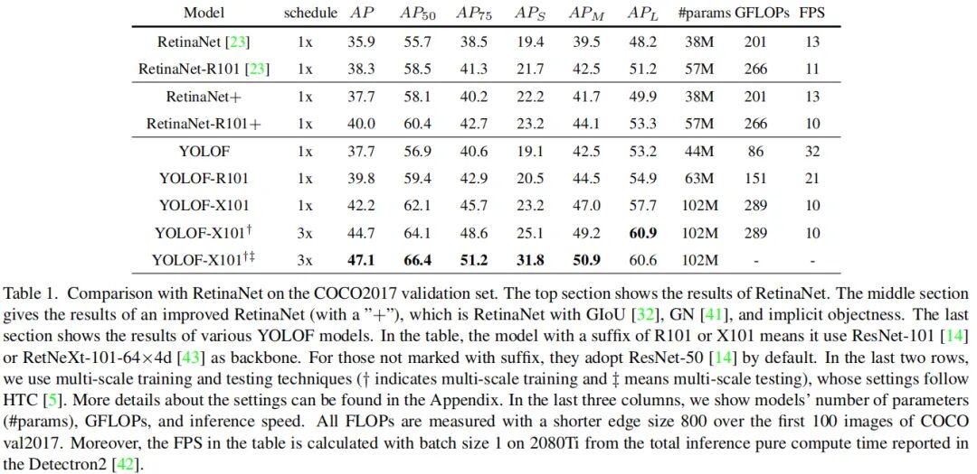YOLOF取得了与改进版RetinaNet+相当的性能,同时减少了57%的计算量,推理速度快了2.5倍; -