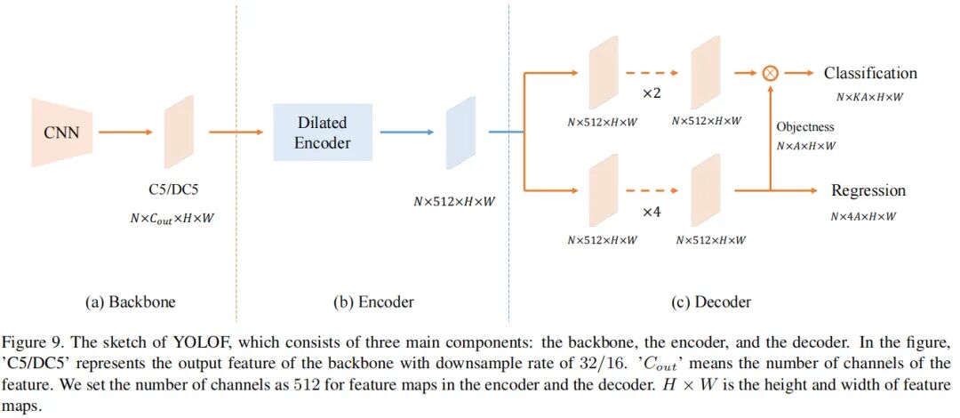 基于上述解决方案呢,作者提出了一种快速而直接的单级特征检测框架YOLOF,它由骨干网络、Encoder以及Decoder构成,整体结构如下图所示。