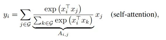 Self-Attention是进行全局信息的建模,因为Self-Attention在每一个位置进行特征映射是平等了考虑了所有位置的特征,可以表示成下面的公式: