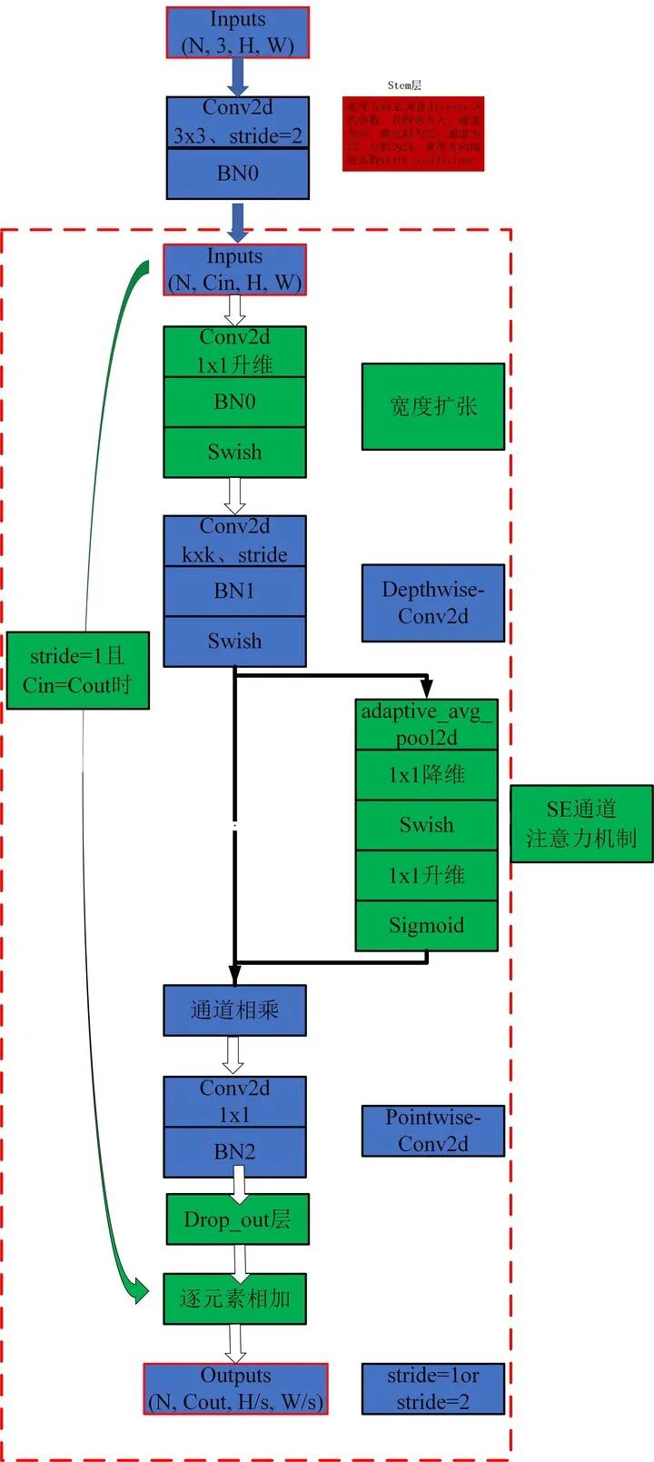 在卷积类型的选择上,作者采用的是MBConv(MBConv的结构见下图,关于MBConv的详细介绍可见[1])。简单的来说MBConv就是有两个特点:1)采用了Depthwise Convlution,因此相比于传统卷积,Depthwise Conv的参数能够大大减少;2)采用了“倒瓶颈”的结构,也就是说在卷积过程中,特征经历了升维和降维两个步骤,这样做的目的应该是为了提高模型的学习能力。
