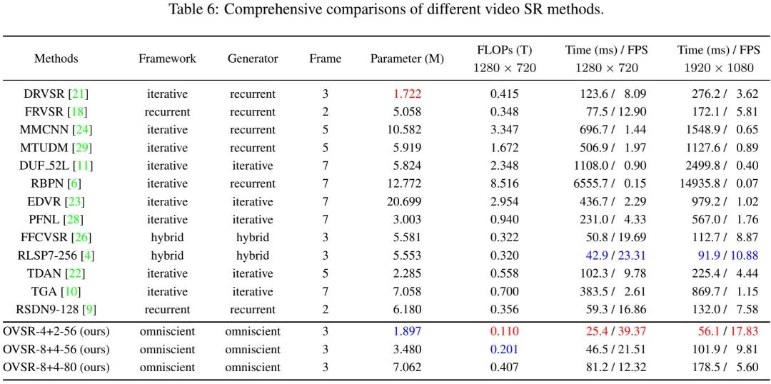 上表从方案类型、帧数、参数量、计算量、推理耗时等各个维度进行了对比分析。本文所提轻量型OVSR-8+2-56取得了最快的推理速度:720p实时;中等模型OVSR-8+4-56在指标上超越其他方案的同时具有更快的推理速度;重度模型OVSR-8+4-80牺牲了推理速度得到了最佳的指标,视觉效果可参见下图。