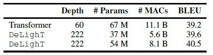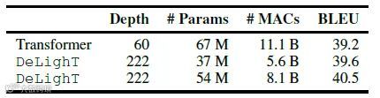 由 个DeLighT block 构成的Transformer的总的深度是: ,其中 是原版Transformer的深度,剩下的是GLT layers的深度。