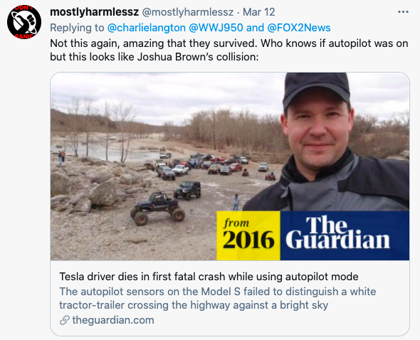 本来以为这是特斯拉史上第一次自动驾驶致死事故,但是后来发现中国的一起特斯拉Model S撞击道路清扫车的致死事故发生得更早一些。