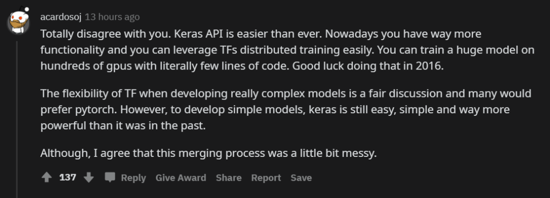 虽然 Keras 并入 TensorFlow 造成了一些混乱,但有不少开发者认为,这一举动并没有毁掉 Keras,反而解决了很多实际问题。