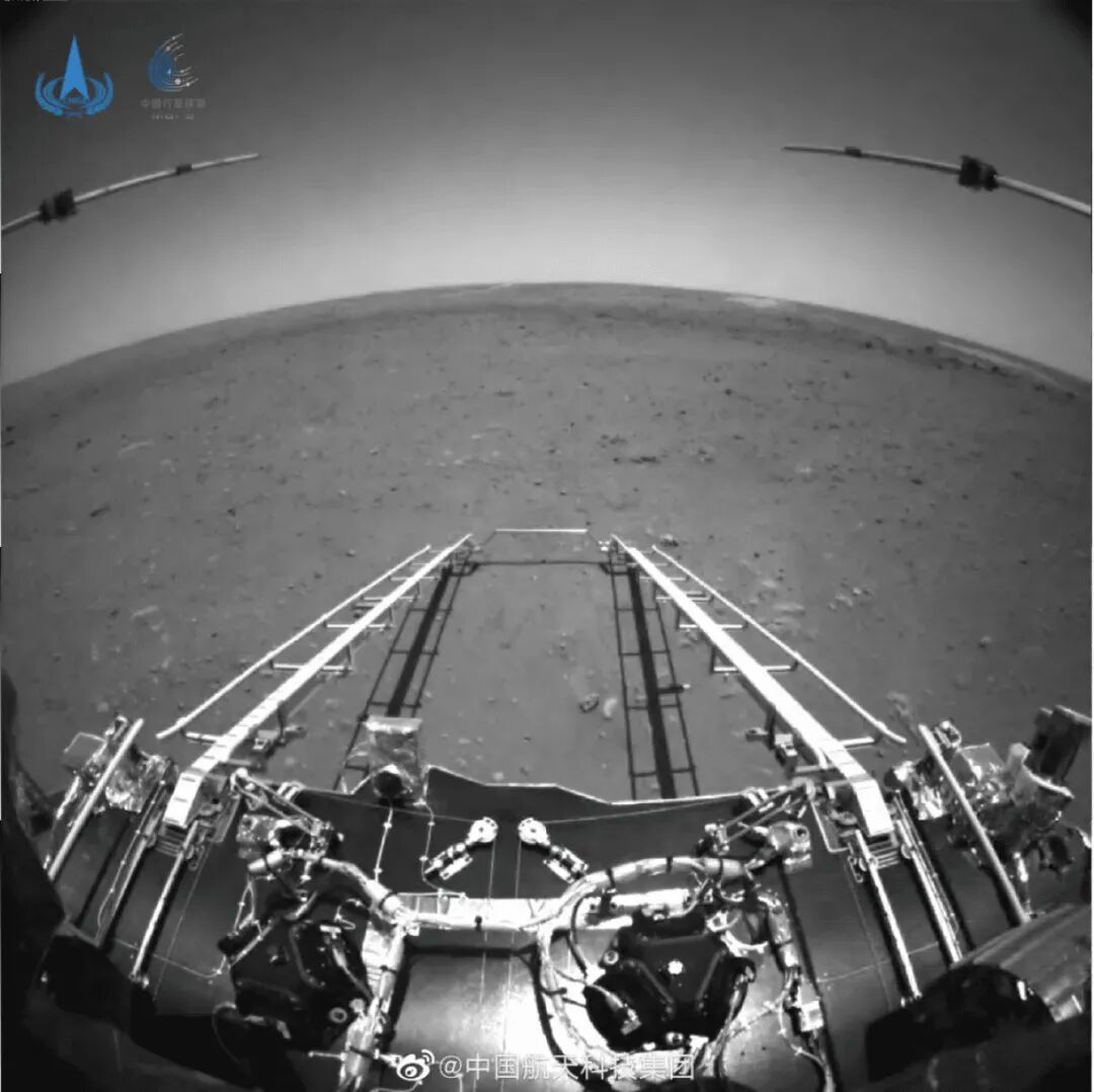 2021年5月19日18点多,中国火星探测器拍摄的第一张图片在互联网上发布。图片是火星车的前避障相机拍摄,为了追求广角,所以拍到的照片有鱼眼变形。火星地面成了曲面,而非平面,如下图。