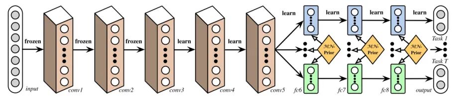 Deep Relationship Networks:从下图,我们可以看到卷积层前几层是预训练好的,后几层是共享参数的,用于学习不同任务之间的联系,最后独立的dnn模块用于学习各个任务。