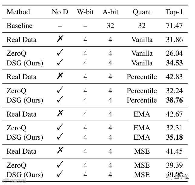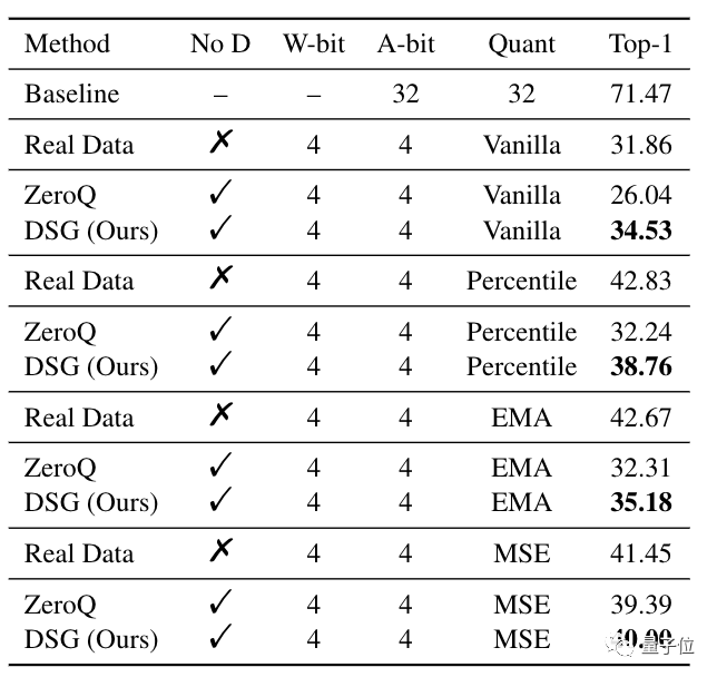 结果表明,在ResNet-18和ResNet-50上,DSG在各种比特设置下优于ZeroQ,尤其是在较低比特下。在某些设置下,甚至取得了超过真实数据的结果。