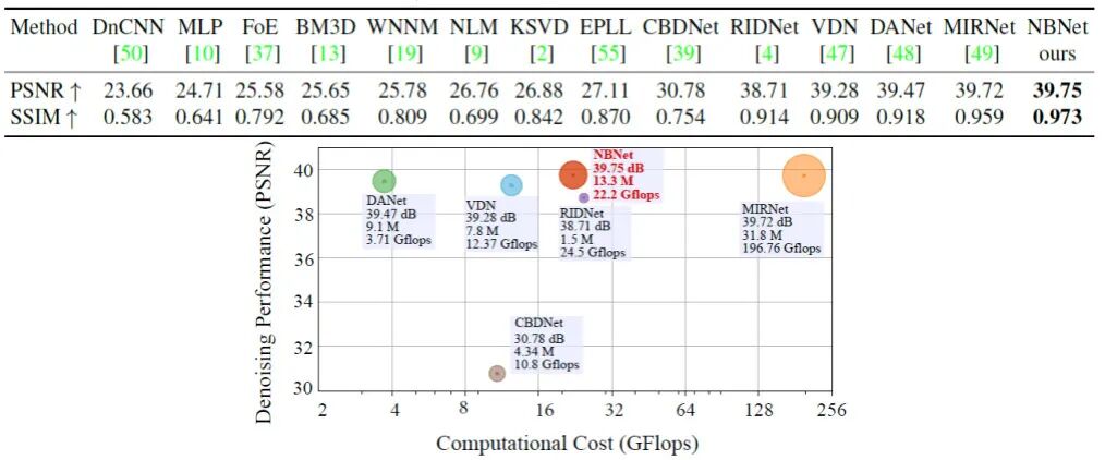 SIDD可以用作测试智能手机摄像头的去噪性能基准,因此用SIDD验证NBNet对真实图像的去噪性能。下表和图展示了性能指标和计算量,本文方法NBNet在PSNR和SSIM两个指标上都比MIRNet有所提高,同时计算量和参数量大幅度降低。