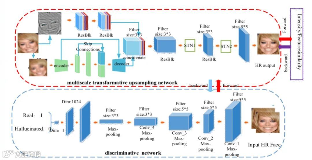 2020年Xin Yu等提出了一种可同时实现图像正面化生成和超分辨率的变换判别神经网络(MTDN)。MTDN由两部分组成:一个组合了自动编码器,空间转换网络层,上采样层和残差块层的多尺度变换上采样网络,以及一个由卷积层,最大池化层和全连接层组成的判别网络。多尺度变换上采样网络旨在以不同分辨率接收和超分辨LR图像,而判别网络的发展则是迫使超分辨脸部变得逼真。MIDN能够在不同的大姿势中有效地对齐和升采样低分辨率图像,并且升采样的图像类似于其对应的高分辨率的图像。