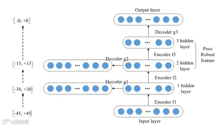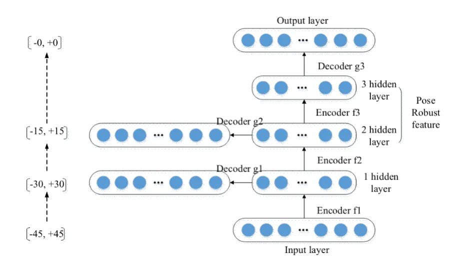 如2014年Kan等针对由姿态差异引起的脸部外表变化比由身份差异引起的变化大的问题,提出了堆叠步进自编码器 ( Stacked Progressive Auto-Encoder,SPAE)的非正面人脸图像转换为正面人脸图像的方法。具体来说,堆叠网络的每个浅渐进式自动编码器被设计为将处于较大姿势的面部图像映射到处于较小姿势的面部图像,同时将那些图像以较小的姿势保持不变。然后,堆叠多个这些浅自动编码器可以将非正面人脸图像逐步转换为正面人脸图像,这意味着姿势变化逐步缩小为零。因此,堆叠网络的最顶层隐藏层的输出包含非常小的姿势变化,可用作姿势识别的姿势稳健特征。