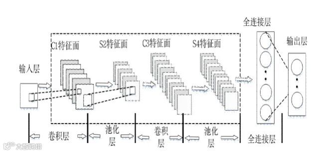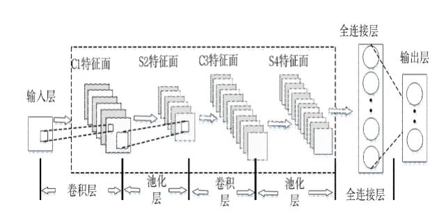 CNN由输入层、卷积层、激活函数、池化层、全连接层组成,其结构如图4所示,其中卷积层遵循权值共享原则,来进行特征提取,通常会使用多层卷积层得到更深层次的特征图;激活函数的作用是保证数据输入与输出是可微的;池化层往往在卷积层之后,其作用是对输入的特征图进行压缩提取主要特征,防止过拟合发生;全连接层的作用是连接所有的特征,将输出值送给分类器,达到分类的目的。
