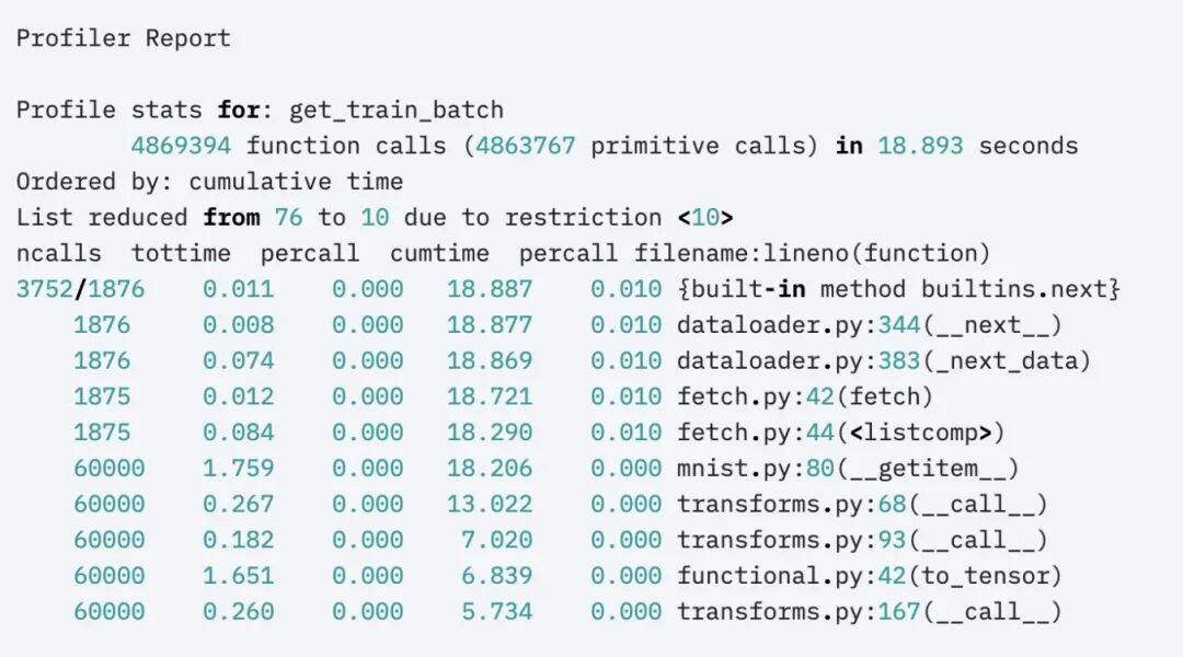 如果没有Lightning,最后一条建议可能很难实现,但你可以使用cprofiler这样的工具来实现。然而,在Lightning中,你可以通过两种方式获得所有在训练期间所做的调用的总结: