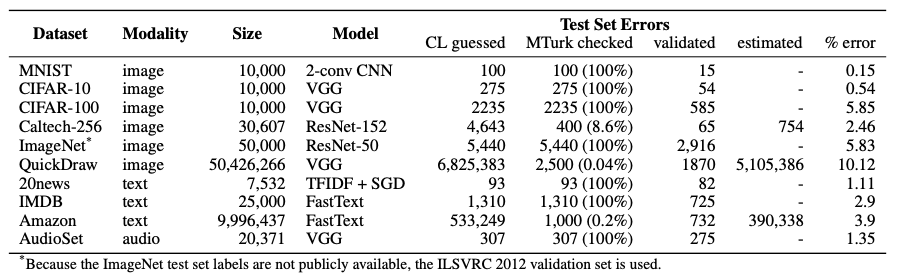 如果测试集不靠谱,那测出来的模型性能会靠谱吗?MIT研究了10个流行的CV的数据集,平均测试集的错误率超过3.4%,最多的竟然错误超10%。 >>加入极市CV技术交流群,走在计算机视觉的最前沿