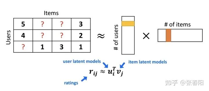 上面右边的矩阵是怎么来的呢?我们把上面的这个问题稍微的简化以下,只看成是一个和用户和物品两个维度相关的task,那其实我们就可以通过估计两个矩阵的点乘的形式,来对原有的矩阵表示。这两个向量中表示的就分别是用户的embedding和电影的embedding。我们反过来思考下,这种办法的核心思想就是是通过两个低维小矩阵(一个代表用户embedding矩阵,一个代表物品embedding矩阵)的点乘计算,来模拟真实用户点击或评分产生的大的协同信息稀疏矩阵,本质上是编码了用户和物品协同信息的降维模型。