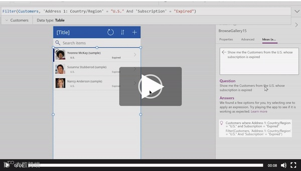比如,我们想实现一个「找到所有在美国订阅过期的用户」的指令,过去在Power Fx上,我们需要构建一个Power Fx语句来实现查找,但现在有了GPT-3,我们只需要把我们的需求以正常的语言表达输入进去,它就可以直接帮你翻译成Power Fx的代码语句,比如像下面图片显示的一样。