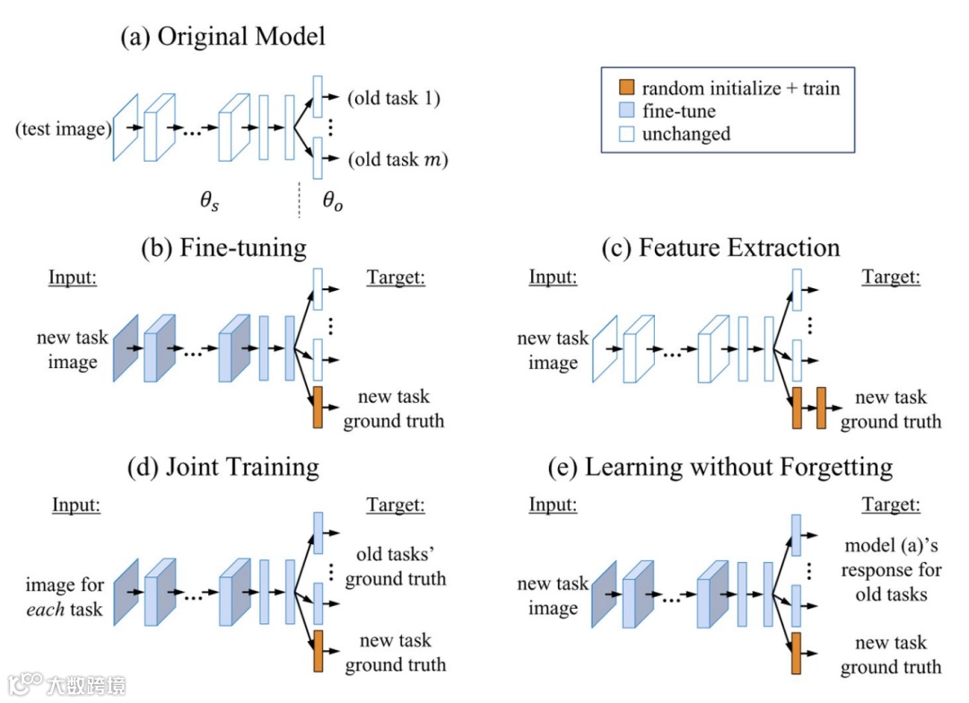 上图展示了一个具有多头网络结构的模型学习新任务的不同策略,其中(a)为已经训练好的基于CNN的原始模型,