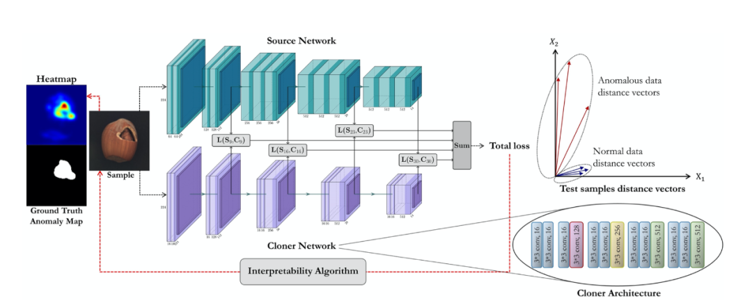 基于此,文中建议在 ImageNet 上预先训练的专家网络的各个层使用特征的“蒸馏”,将其转换为更简单的克隆网络来解决这两个问题。使用给定输入数据的专家和克隆网络中间激活值之间的差异来检测和定位异常。