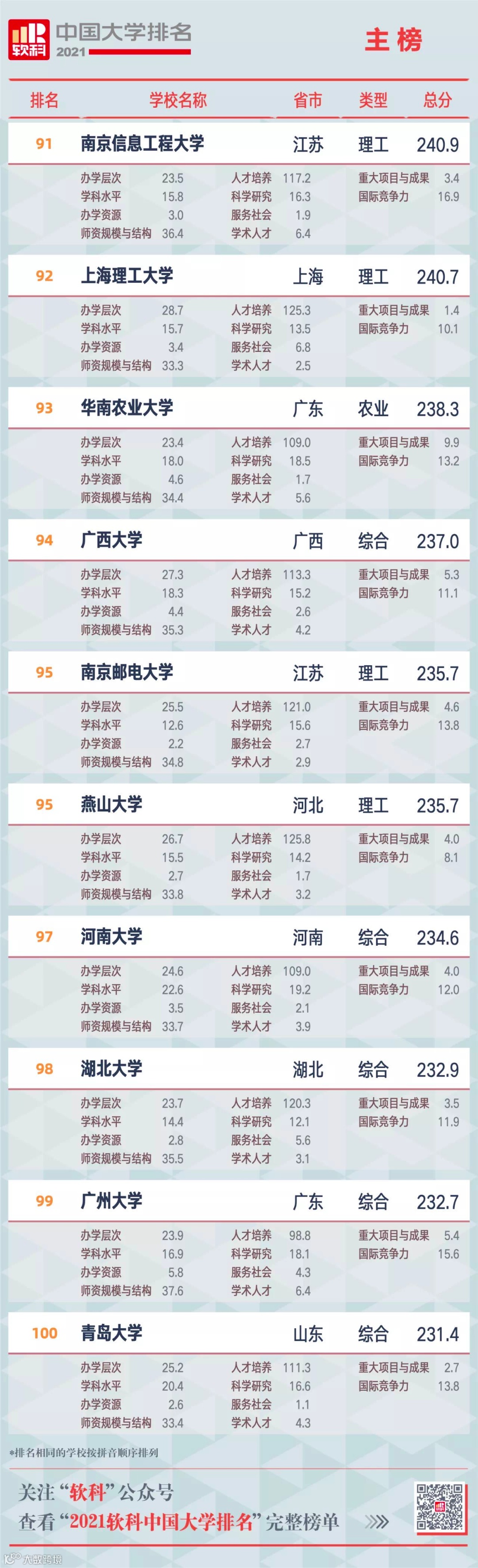 百强名单中「双一流」高校共有86所,其中广西大学排名较2020年上升7名,位列全国第94。