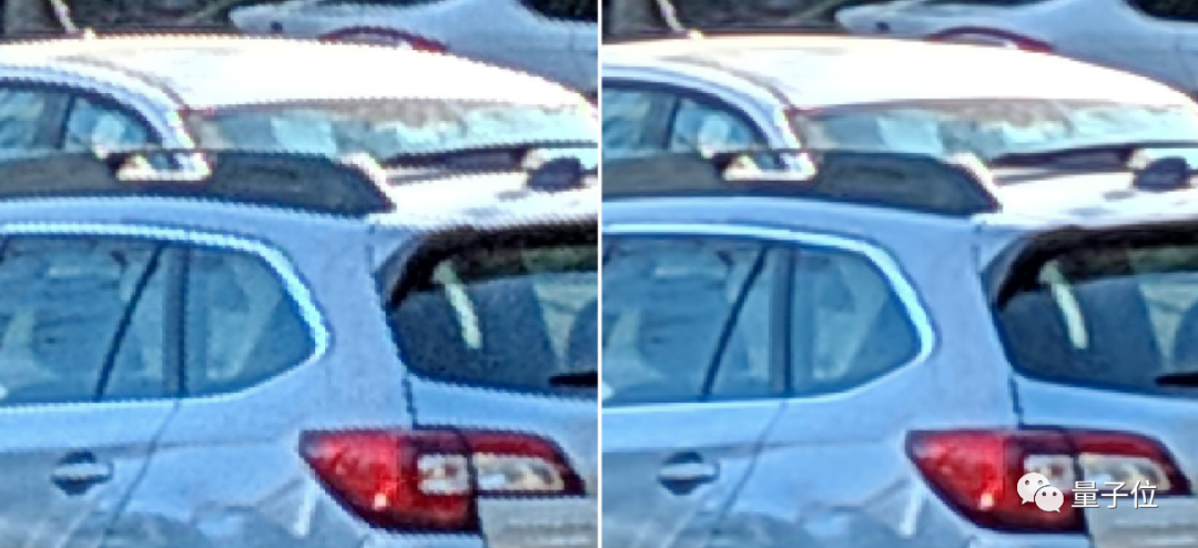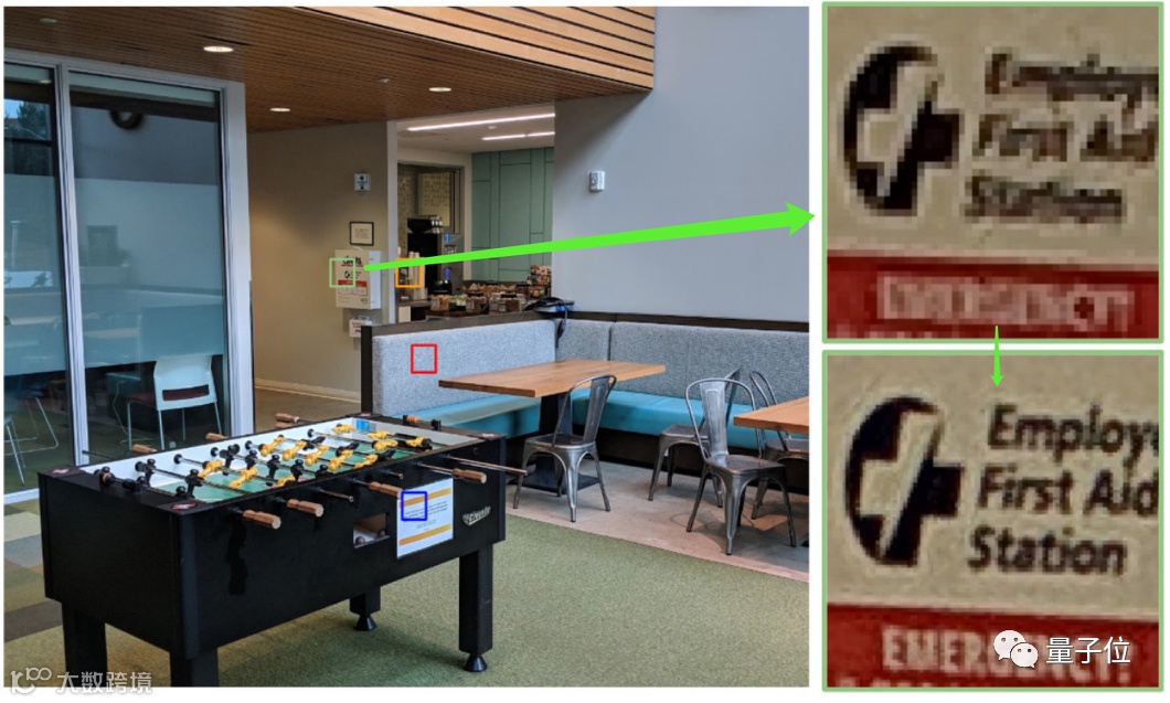 经过算法调整后,照片几乎立刻就清晰了数倍,连角落里模糊的文字都看得清: