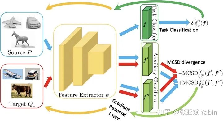 理论方面:提出了Multi-Class Scoring Disagreement (MCSD) divergence来衡量两个域数据分布之间的差异;其中MCSD可以充分衡量两个scoring hypotheses(可以理解为分类器) 之间的差异。基于MCSD divergence, 我们提出了新的Adaptation Bound, 并详细讨论了我们理论框架和之前框架的关系。 -