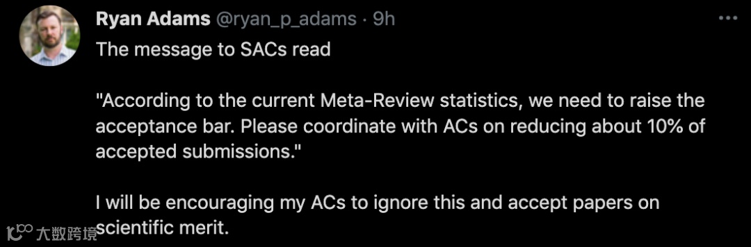 普林斯顿大学计算机教授 Ryan Adams 透露,本次降低的接收比例大概是10%:「根据当前的 Meta-Review 统计数据,我们需要提高接收标准。请与 AC 协调以减少大约10%的接收。」