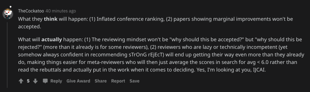 实际效果:1、审稿心态变为「为什么要拒掉这篇稿」,而不是「为什么要接收这篇稿」;2、技术上不合格或懒惰的审稿人变得更加不认真,为了让均分低于6.0而审稿,不再好好阅读Rebuttal。