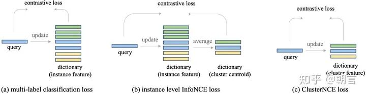 我们发现,图片特征的存储和更新对于网络的训练影响很大。一个最简单的直觉就是,在一个行人重识别数据集中,不同的人拥有的图片数量是不一样的,如果按照训练的图片来更新feature的话,拥有大量图片的人的feature将会滞后更新,从而有害网络优化。所以ClusterContrast的核心思想就是,我们不再是从图片的层面上去更新特征和计算loss, 而是从人的维度去更新和计算loss。无论一个人有多少张图片,对于网络训练来说,他们都是一视同仁的,都是用同一个速度去更新特征。在无监督reid中,每个人都被聚类成一个cluster,所以我们的方法叫做ClusterContrast。具体可以参加下图: