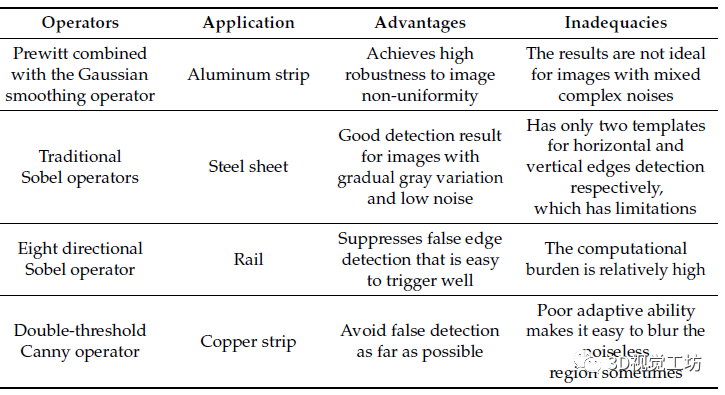其中,边缘检测是一种检测被测图像中的灰度或结构突变的方法。缺陷区域和背景之间的灰度级差异导致边界处出现明显的边缘,可用于检测金属平面材料的表面缺陷。由于图像边缘像素的不连续性,研究人员通常采用局部图像微分技术来获取边缘检测算子,金属平面材料表面缺陷的常用边缘检测模板包括Prewitt,Sobel 和Canny 运算符,下图显示了在相同缺陷样本上这些原始运算符的检测结果。