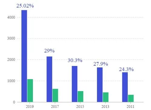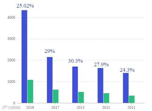整体上看,ICCV的投稿论文数逐年递增趋势非常明显,从2011年至2019年,投稿数翻了3倍,但是接收率近几年却有小幅下滑。