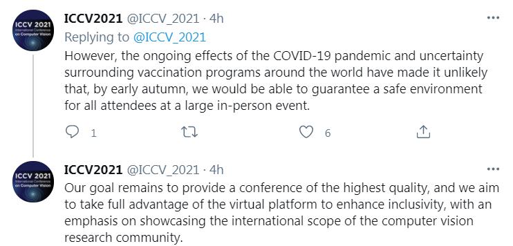 今年ICCV投稿量高达6321篇。按照 ICCV 官方统计,ICCV 2019共计收到4303篇有效论文投稿,而今年则是比2019年增加了2018篇,相对增加了46.9%,接近一半。 >>本周六,极市CVPR2021线下沙龙即将举办,三位CVPR2021论文作者齐聚深圳!【报告二:顾津锦-使用局部归因图理解和可视化超分辨网络】。点击蓝字即可免费报名,名额有限,先到先得!