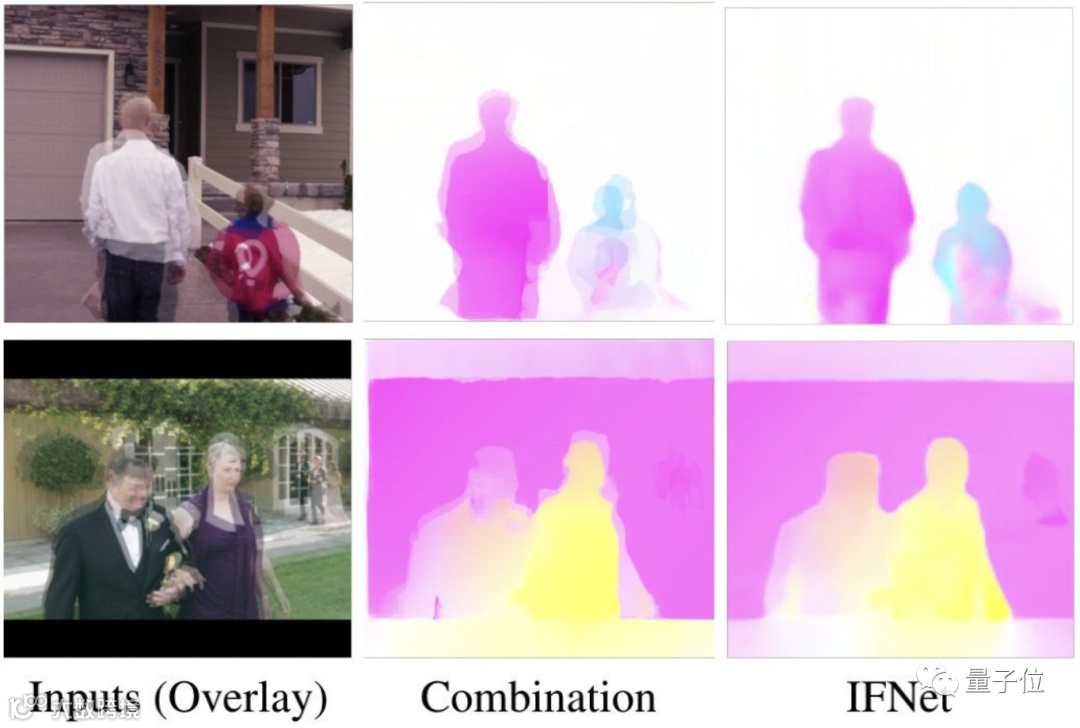 效果也显而易见,相比于利用前后两帧的双向估计所产生的光流,利用IFNET估计出的光流效果非常清晰,而且几乎没有伪影。