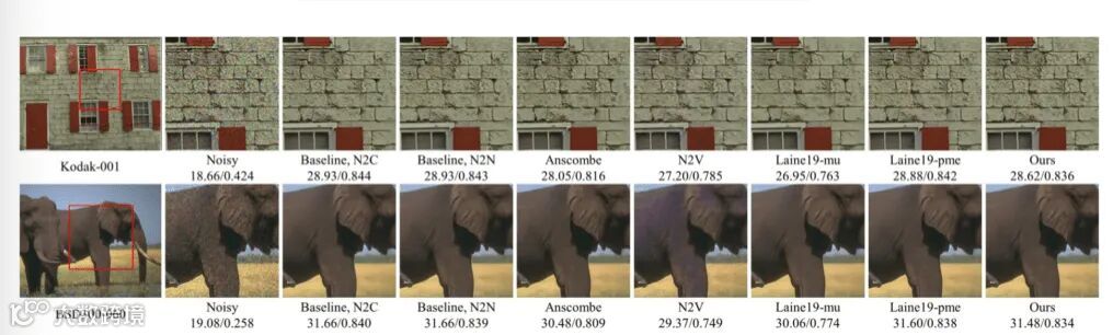 在RGB域合成数据上,我们分别测试了Gaussian和Poisson噪声,每种噪声分别尝试了固定噪声水平和动态噪声水平两种情况。数值比较的结果如下表所示。结果表明,在多个测试集上,本方法在性能上比使用配对数据训练的方法(N2C)低0.3dB左右,超越了现有的自监督降噪方法。在动态噪声水平的场景下,本方法显著超越其他自监督方法,甚至与自监督+后处理的Laine19不相上下,这更进一步说明了本方法的有效性。