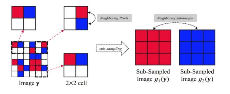 对于采样器G,我们设计了近邻采样,即将图像划分成 的单元,在每个单元的四个像素中随机选择两个近邻的像素分别划分到两个子图中,这样构造出来两张"相似但不相同"的子图,我们称他们为"Neighbor"。