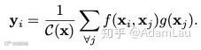 其中x表示输入信号(图片,序列,视频等,也可能是它们的features),y表示输出信号,其size和x相同。f(xi,xj)用来计算i和所有可能关联的位置j之间pairwise的关系,这个关系可以是比如i和j的位置距离越远,f值越小,表示j位置对i影响越小。g(xj)用于计算输入信号在j位置的特征值。C(x)是归一化参数。理解: i 代表的是当前位置的响应,j 代表全局响应,通过加权得到一个非局部的响应值。
