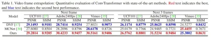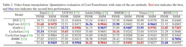 研究者将经过训练的 ConvTransformer 在几个公共基准上与 SOTA 视频插帧和视频帧推断算法进行比较,包括 DVF、MCNet、SepConv、CyclicGen、DAIN 和 BMBC。表 1 和表 2 分别说明了几种算法在视频插帧和未来帧推断方面的定量比较结果。