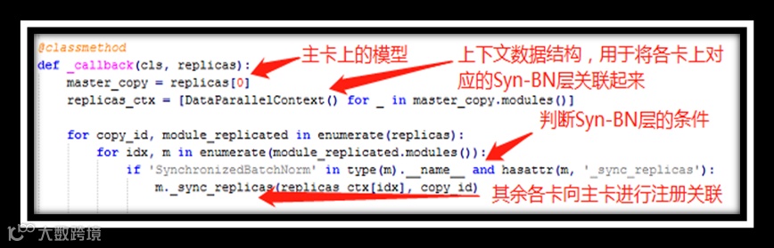 自定义的回调函数,将各卡对应的Syn-BN层进行关联,其中DataParallelContext是一个自定义类,其中没有定义实质性的东西,作为一个上下文数据结构,实例化这个类的对象主要用于将各个卡上对应的Syn-BN层进行关联;_sync_replicas是在Syn-BN中定义的方法,在该方法中其余子卡上的Syn-BN层会向主卡进行注册,使得主卡能够通过某种数据结构和各卡进行通信。