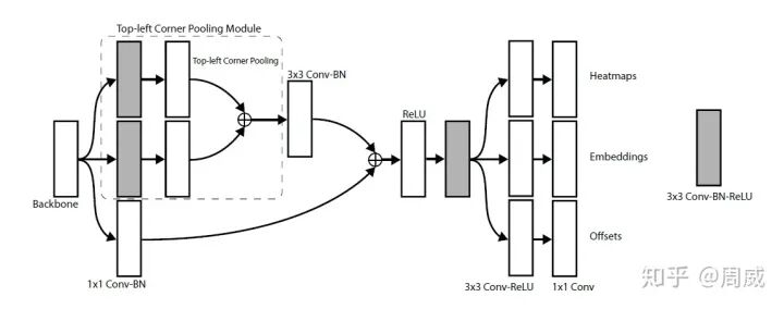 2. head: 二分支输出 Top-left corners 和 Bottom-right corners,每个分支包含了各自的corner pooling以及三分支输出