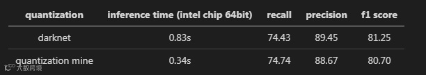 为了尽可能的不影响精度,我选择在yolo层的上面一层conv层不进行量化。测试结果如下,可以看到