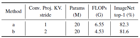 作者在计算query时,采用的Depthwise-separable Convolution的stride值为1。在计算key和value时,采用的Depthwise-separable Convolution的stride值为2。如下图7所示。按照这种方式,token的数量对于key和value来说可以减少4倍,性能只有很少的下降。