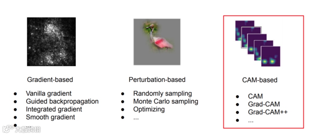 基于梯度的可视化是通过将目标类别上的决策分数往原始图像上求取梯度得到,可视化结果如上图(左)。梯度作为一种局部信息,反映了局部位置的扰动对于决策分数的影响。我们常见的Saliency Map [6], 即通过该种方式得到。除此之外,近几年还出现多种基于梯度的改进方法,其中Smooth Gradient [2] 与Integrated Gradient [3] 最为著名,它们分别分析了原始梯度可能存在的一些问题,然后通过平滑和路径积分的方式,得到了更为清晰的可视化结果。值得一提的是,Guided-Backpropagation目前在可解释性方面存在较大争议,它是通过对于回传梯度进行一定过滤,从而得到更为干净和聚焦的可视化结果,但在Sanity Check [9] 中,作者发现,该方法与模型参数无关,即初始化模型参数后,仍然能得到相似结果。