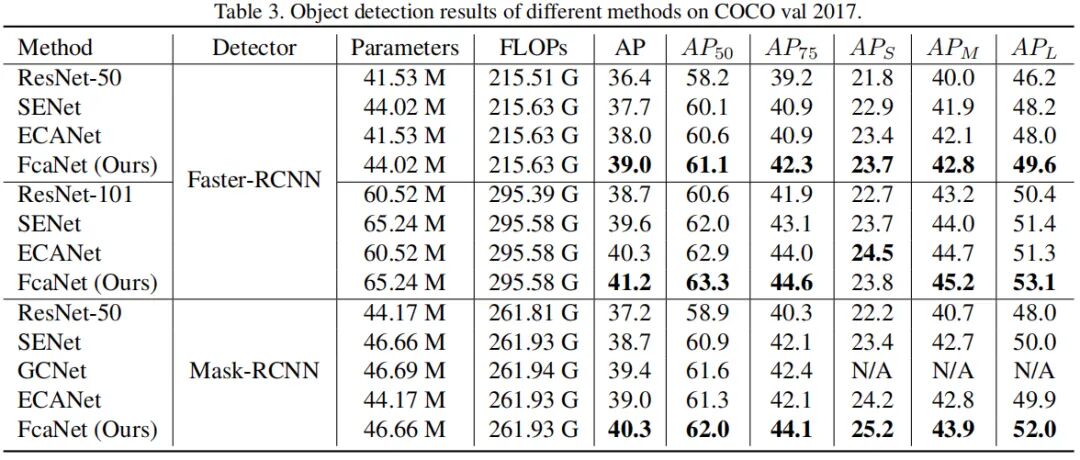 下图给出了COCO目标检测任务上的性能对比,可以看到:所提方法取得了更佳的性能。FcaNet以较大的性能优势超过了SENet;相比ECANet,FcaNet仍能以0.9-1.3%指标胜出。