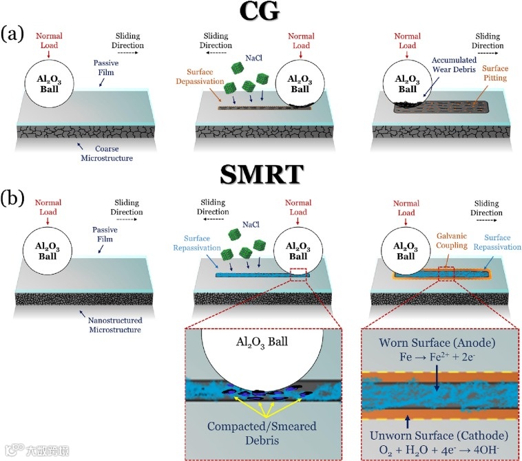 Source: 上圖對比了粗晶粒(CG)材料和SMRT處理材料在氯化鈉滑動接觸下的磨損-腐蝕機制。SMRT材料表現出更強的表面再鈍化能力,有效地抵抗了氯離子引起的去鈍化。