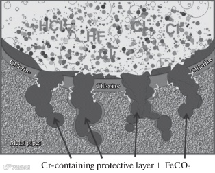 Source: 此圖展示了金屬合金在富含氯離子的環境中發生的腐蝕過程,顯示了氯離子誘導的點蝕、裂紋以及FeCO₃和含鉻保護層的形成,說明了鐵鹽對腐蝕機制的複雜影響。