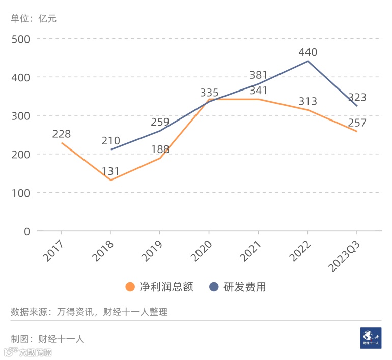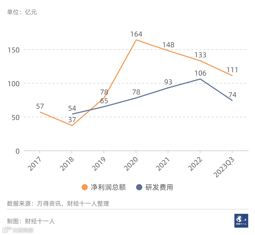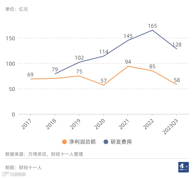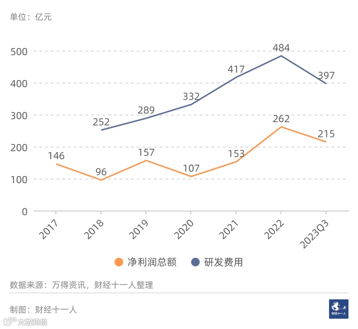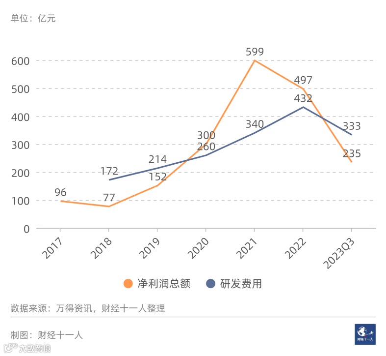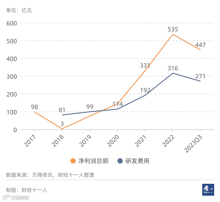 图3是2017年以来每年的行业净利润总额以及研发费用总额。2017年到2022年,净利润总额复合增长率40.4%。