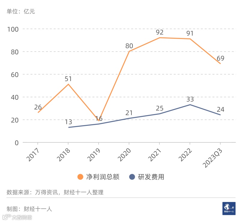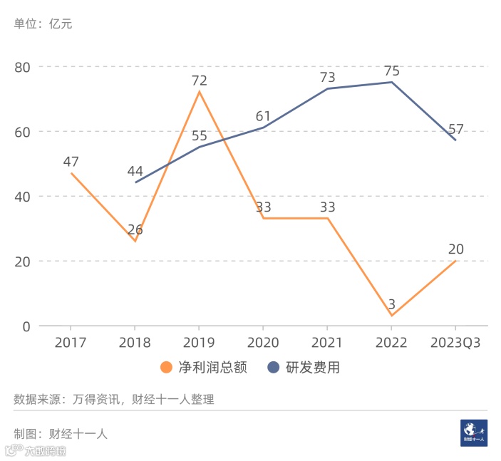 行业有46家样本公司,2024年1月20日总市值为2668亿元。图9是2017年以来每年的行业净利润总额以及研发费用总额。2017年到2022年,行业净利润总额从47亿元,降低到3亿元。