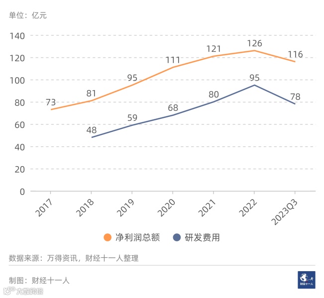 图10是2017年以来每年的行业净利润总额以及研发费用总额。2017年到2022年,净利润总额复合增长率为4.3%。